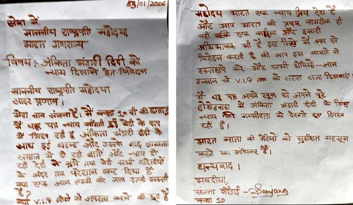 अपने पत्र में संजना बौड़ाई ने लिखा है कि भारत एक न्यायप्रिय देश है, जहां कोई भी व्यक्ति कानून से ऊपर नहीं हो सकता। उन्होंने कहा कि अंकिता भंडारी जैसी बेटियों के साथ हुई घटनाएं पूरे समाज को झकझोर देती हैं और यदि ऐसे मामलों में प्रभावशाली लोगों को संरक्षण मिलता है, तो इससे आम नागरिकों का न्याय व्यवस्था से विश्वास कमजोर पड़ता है। पत्र में दोनों बहनों ने राष्ट्रपति से आग्रह किया है कि वे इस संवेदनशील मामले में हस्तक्षेप करें और प्रभावशाली (वीआईपी) दोषियों की शीघ्र गिरफ्तारी सुनिश्चित कराएं। उन्होंने कहा कि जब तक सभी दोषियों को सख्त सजा नहीं मिलती, तब तक न्याय अधूरा रहेगा।