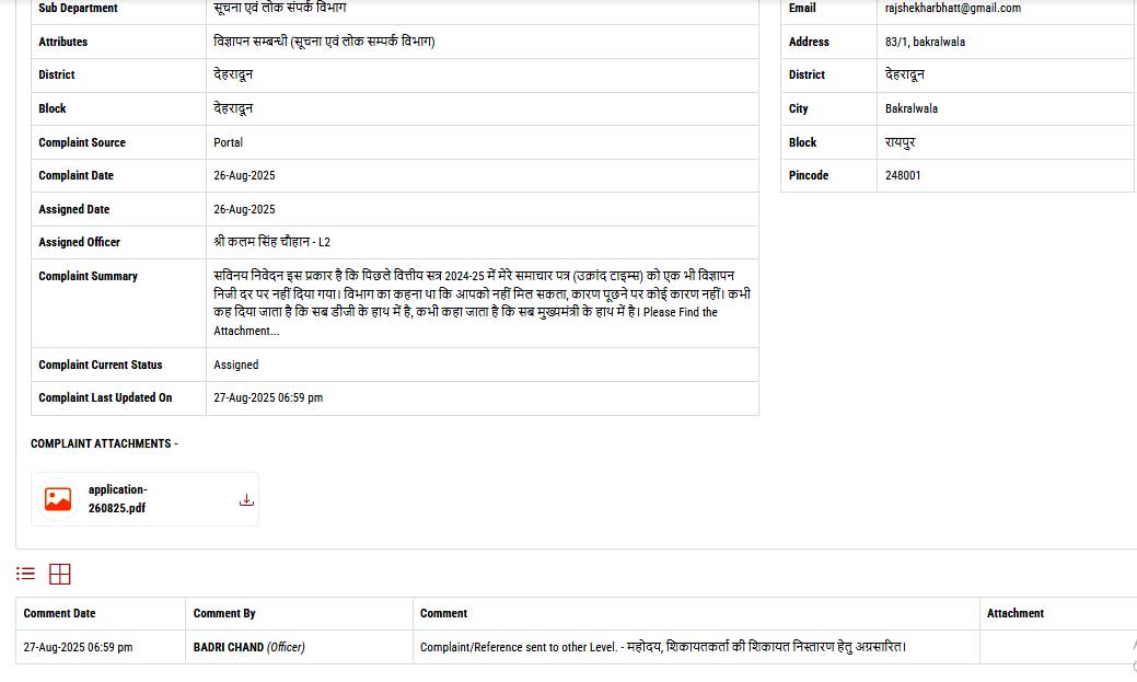 अब सामने आता है दूसरा मामला, दूसरी शिकायत, दूसरा प्रार्थना पत्र। यह शिकायत मुख्यमंत्री समाधान पोर्टल में 29 अगस्त 2025 को सबमिट की गयी थी। इस शिकायत में भी उपरोक्त प्रक्रिया के तहत ही कार्य किया जा रहा है और वर्तमान में यह शिकायत भी एल-2 अधिकारी श्री कलम सिंह चौहान जी के पास ही है। जैसा कि सभी को पता है कि पोर्टल पर विज्ञापन नीति में पारदर्शिता के संबंध में ‘‘सण्डे पोस्ट’’ साप्ताहिक समाचार पत्र की बात बताई गयी थी। इस शिकायत में भी यही पूछा गया है कि उक्त साप्ताहिक समाचार पत्र को किन नियमों अथवा मुख्यमंत्री के किन आदेशों के बाद 10 से 20 लाख तक के विज्ञापन बार-बार दिये गये हैं। किस समाचार पत्र को क्या मिला, कितना मिला उससे कोई परेशानी नहीं है, लेकिन कम से कम पारदर्शिता तो रखें, नियम ही बता दें।