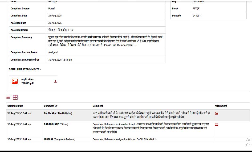 जाहिर है कि पिछले माह 22 अगस्त से सूचना विभाग की विज्ञापन नीति की पारदर्शिता और पक्षपात के संबंध में ही शिकायतें की जा रही है। इसी संबंध में सूचना अधिकार अधिनियम का प्रयोग किया जा रहा है और इसी संबंध में समाचार प्रकाशित किये जा रहे हैं। सवालों के जवाब भी कछुए की चाल में मिल रहे हैं। दरअसल, बात केवल इतनी है कि मुख्यमंत्री समाधान पोर्टल में अब तक दो शिकायतें/प्रार्थना पत्र दिये गये हैं। पहली शिकायत/प्रार्थना पत्र 26 अगस्त 2025 को भेजा गया है, जिसका विषय ‘‘सूचना विभाग द्वारा पत्रकारों से विज्ञापन के लिए किये जा रहे सौतेले व्यवहार’’ से संबंधित है।