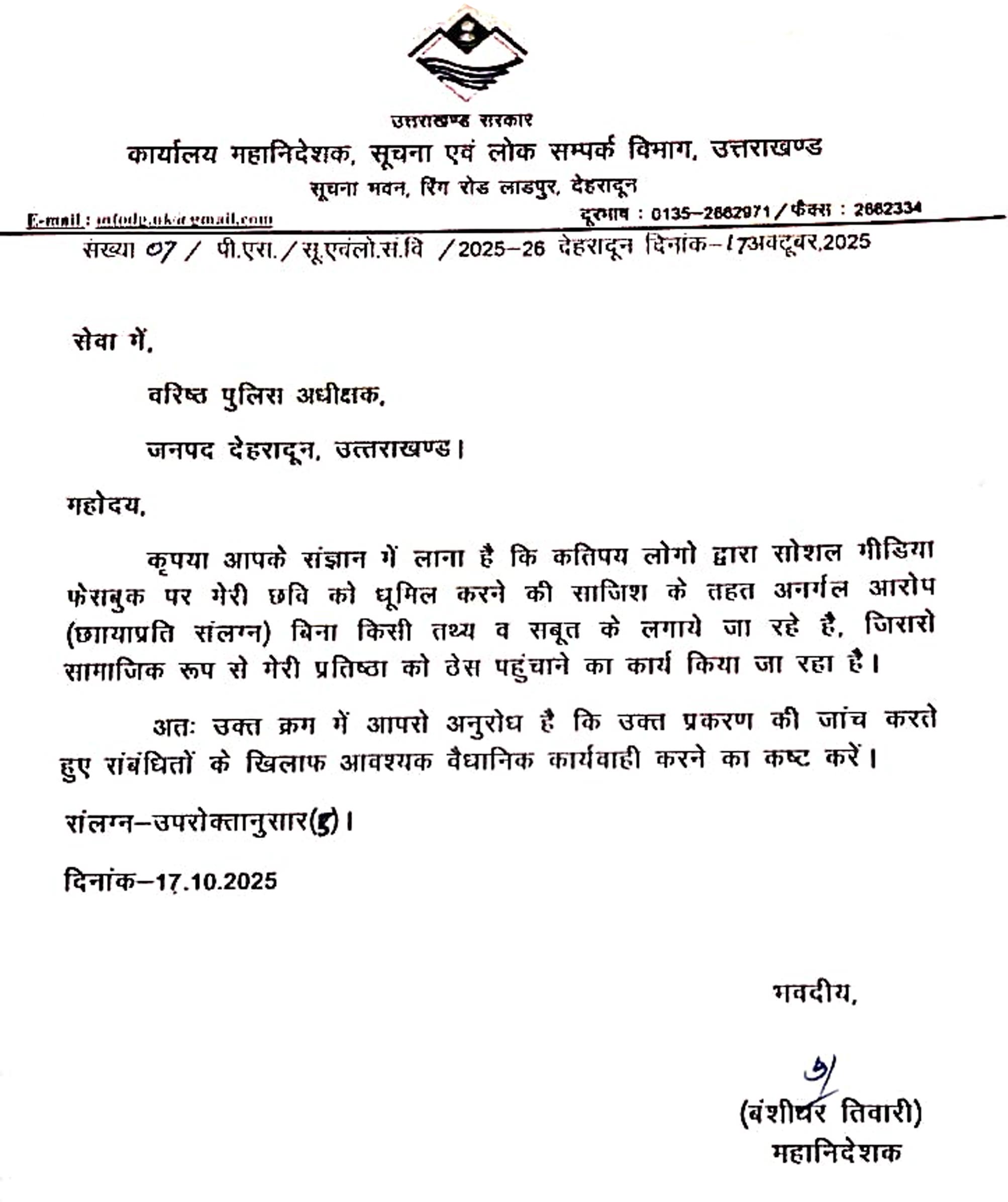 इन टिप्पणियों में भाषा की मर्यादा को इस हद तक पार किया गया कि सोशल मीडिया पर सक्रिय तमाम सजग नागरिकों ने भी इस पर आपत्ति जताई। यह प्रकरण केवल एक व्यक्ति विशेष पर हमला नहीं, बल्कि उस संस्थागत गरिमा पर भी प्रहार है, जो राज्य में सूचना और जनसंपर्क व्यवस्था की पारदर्शिता और जिम्मेदारी सुनिश्चित करती है। सूत्रों के अनुसार, डीजी सूचना बंशीधर तिवारी ने इस मामले को अत्यंत गंभीरता से लेते हुए वरिष्ठ पुलिस अधीक्षक देहरादून अजय सिंह को एक औपचारिक पत्र भेजा है। पत्र में उन्होंने स्पष्ट लिखा है कि –
