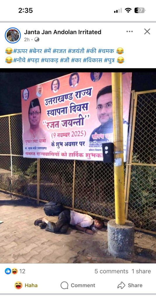 देहरादून। उत्तराखंड राज्य स्थापना दिवस की रजत जयंती (25वीं वर्षगांठ) का जश्न मनाने की तैयारियां पूरे प्रदेश में जोरों पर हैं। सड़कों पर बैनर, होर्डिंग और सजावट से सरकार की उपलब्धियों और विकास योजनाओं का प्रचार किया जा रहा है। लेकिन इन्हीं चमकदार पोस्टरों और बधाई संदेशों के नीचे छिपी एक तस्वीर ने सबको सोचने पर मजबूर कर दिया है— एक व्यक्ति फुटपाथ पर बेबस और असहाय हालत में सोया हुआ है, और उसके सिर के ऊपर लटका है ‘उत्तराखंड राज्य स्थापना दिवस रजत जयंती’ का विशाल बैनर।