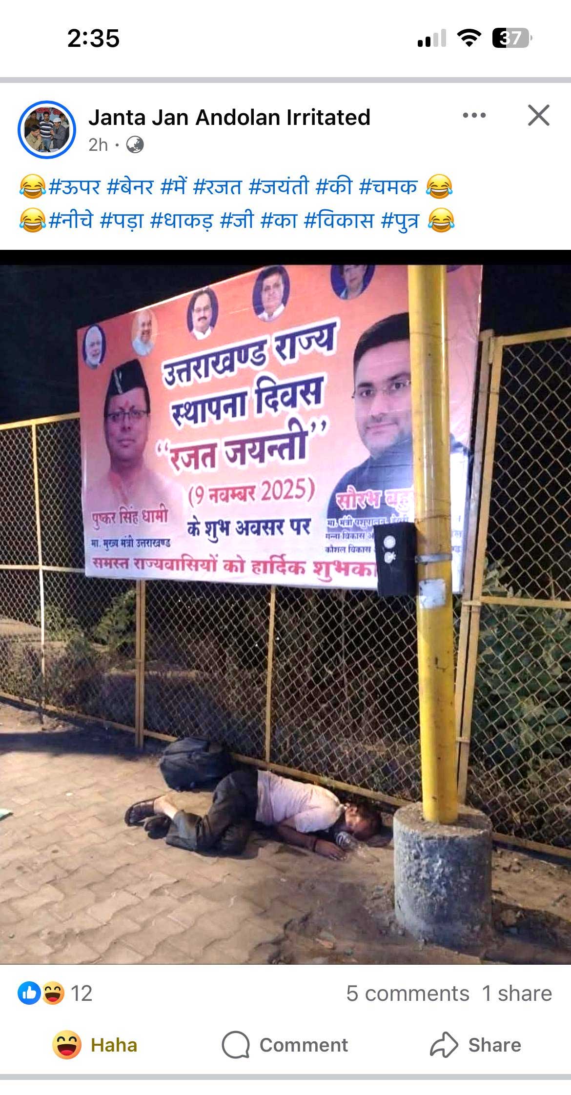 यह तस्वीर राजधानी देहरादून की है, जहां सरकार के मंत्री और जनप्रतिनिधि प्रदेशवासियों को स्थापना दिवस की शुभकामनाएं दे रहे हैं। पोस्टर पर मुख्यमंत्री पुष्कर सिंह धामी और अन्य नेताओं के चित्र हैं, जिनमें विकास, आत्मनिर्भरता और समृद्ध उत्तराखंड का सपना दिखाया गया है। लेकिन उसी बैनर के नीचे एक गरीब व्यक्ति फुटपाथ पर रात गुजारने को मजबूर है। उसके पास बस एक पुराना बैग है, और तन ढकने के लिए मैले कपड़े। यह दृश्य विकास और वास्तविकता के बीच के अंतर को गहराई से उजागर करता है।